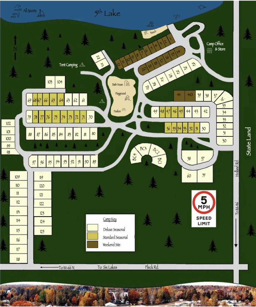 About Us Camp Charges * Season from May 1st - Oct 1st Rates Extra Tent With Boat Guest Pass Nightly $45.00 + $10.00 Per Night + $5.00 Per Day + $5.00 Per Day/Car Seasonal $1700 - $2000 * Included Seasonal Boat Slip $300 * !! Reminder, We Do Not accept any Credit/Debit Cards !! Modern Camping Sites for RV's and Tents Water Wonderland Six Connected Lakes Seasonal Lots May 1st - October 1st Camp Map